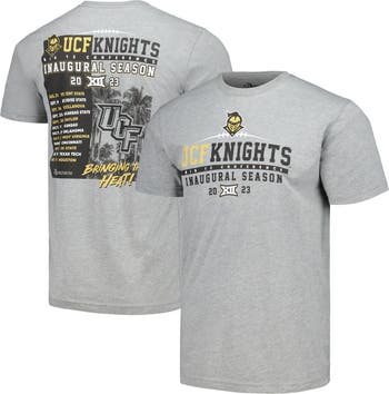 Celebrate the UCF Knights' historic entry into the Big 12 with the Men's Heather Gray UCF Knights Inaugural Big 12 Schedule T-Shirt. Officially licensed, this tee proudly displays the Knights' logo and the upcoming schedule in screen print graphics. Made from a comfortable cotton and polyester blend, it's perfect for game days or showing support for the UCF Knights.