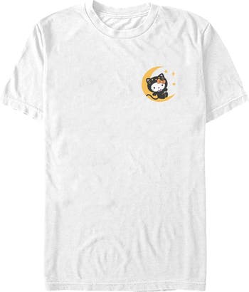 - Show off your impeccable taste with this stylish new men's t-shirt that is perfect for every occasion! Featuring Hello Kitty wearing a black cat costume, lying on a crescent moon printed on the left pocket.