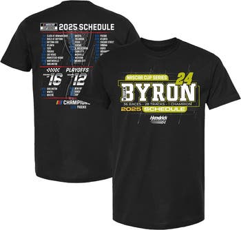 Commemorate the 2025 NASCAR Cup Series with this William Byron Schedule T-Shirt. This Hendrick Motorsports Team Collection shirt features bold William Byron graphics on the front and the series schedule on the back, putting your die-hard NASCAR fandom on full display. Get pumped up and ready to cheer for William Byron by adding this comfy cotton tee to your racing collection.