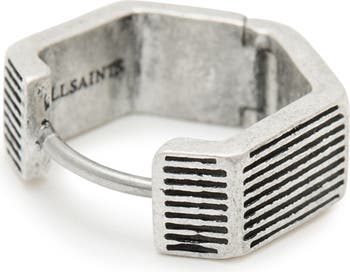 A single hexagonal huggie hoop earring rendered in sterling silver and etched with grooves brings a modern, geometric touch to your lobe.