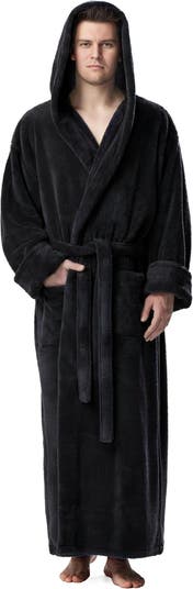 Men’s Hooded Ankle Length Fleece Bathrobe. This full length bathrobe is designed for men who value softness, comfort, and durability. Cozy and warm, it is perfect for lounging at home, taking an afternoon nap, or walking around the house. The luxurious ankle-length design provides full coverage, making it ideal for colder days, while its durable construction ensures years of comfort. Available in sizes S/M (54" long, 63" waist circumference), L/XL (57" long, 65" waist circumference), and XXL (59" long, 67" waist circumference). Versatile and stylish, this hooded fleece robe can be worn as lounge wear, when working from home, or even as a smoking jacket. It also makes a thoughtful gift for any occasion. Product Care Instructions: Wash before first use. Wash dark colors in cold water and light colors in warm water. Tumble dry low or no heat. Do not bleach.