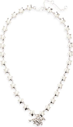 Bring modern edge to your look with striking chain necklace showcasing star links and a racing horse pendant. This necklace is crafted from sterling silver with an oxidized finish.