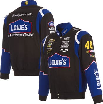 This Jimmie Johnson Lowe's Twill Driver Uniform Full-Snap Jacket is just what you need to show off your die-hard NASCAR fandom. The embroidered graphics and vivid sponsor colors will let everyone know that Jimmie Johnson is your favorite driver. This midweight JH Design jacket features a ribbed knit hem and cuffs for a great fit, as well as multiple pockets to hold your necessities.