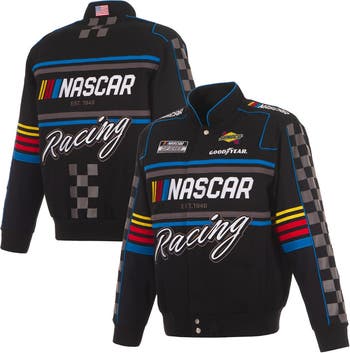 Represent your love for stock-car racing with this NASCAR Full-Snap Twill Uniform Jacket from JH Design. This stylish jacket features embroidered graphics and eye-catching trims for a bold look. The ribbed knit cuffs and waist hem provide a secure fit, while the two front slip pockets and two interior pockets offer ample storage for your essentials on race day.