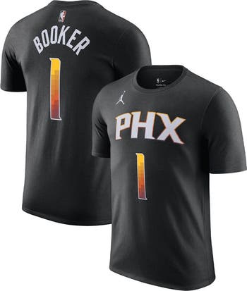 Showcase your love for Devin Booker and the Phoenix Suns with this Statement Edition Name & Number T-shirt from Jordan Brand. It features bold graphics inspired directly by the team's authentic jerseys. Pair this tee with your favorite team shorts or a hat for the ultimate game day look.