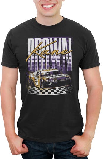 - Get ready to hit play on some serious country vibes with this stylish new men's t-shirt that is perfect for every occasion! Featuring a purple and yellow racing car with the name "Kane Brown" printed above and a fun checkered pattern across the front.