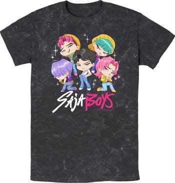 We're going up, up, up, and these trendy designs from the new animated film K-Pop Demon Hunters won't stay behind! Whether you're a demon hunter or a regular idol, you can't go wrong with this Men's Saja Boys Chibi Group Mineral Wash T-shirt that features your favorite boy band, with Jinu, Romance, Abby, Baby, and Mystery in a cute chibi style and the Saja Boys logo printed below. Get golden to conquer the Idol Awards and embrace your true self to show the world how it's done!