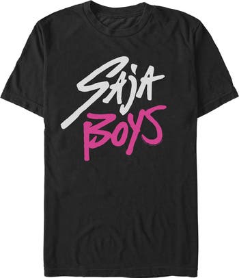 We're going up, up, up, and these trendy designs from the new animated film K-Pop Demon Hunters won't stay behind! Whether you're a demon hunter or a regular idol, you can't go wrong with this Men's Saja Boys Logo Graphic T-shirt that features your favorite boy band logo, Saja Boys, in pink and white lettering. Get golden to conquer the Idol Awards and embrace your true self to show the world how it's done!