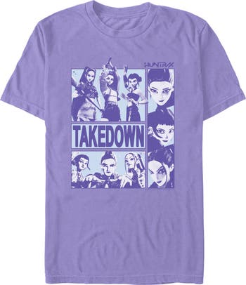 Prepare for debut with these incredible designs from the new, top-charting Netflix Film: K-Pop Demon Hunters! Dance to Soda Pop or Takedown with this Men's Takedown Huntrix Logo Graphic T-shirt featuring committed depictions of Rumi, Mira, and Zoey in purple, monochromatic panels. The song title "Takedown" as well as the band's logo are included in the print. These designs are going to be everything you can think of, so gear up to take all demons down while looking like the greatest idol the world has ever seen with out-of-this-world, officially licensed K-Pop Demon Hunters apparel!