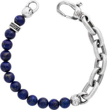 The shine of lapis-lazuli beads contrasts the matte texture of sterling silver chain links in this mixed-media bracelet detailed with subtle logo branding.
