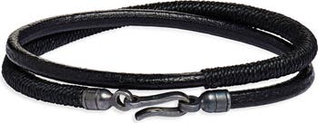 A sterling silver hook secures this handmade macramé bound leather bracelet that wraps and wraps around your wrist.