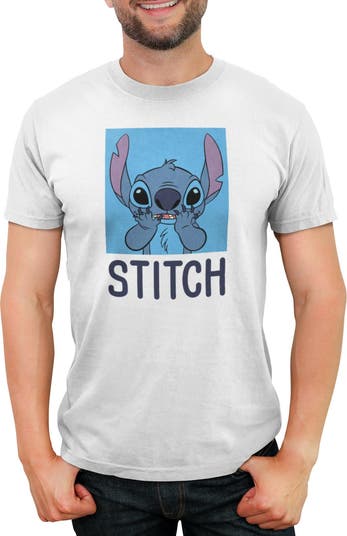- Plan your next misadventure with this stylish new men's t-shirt that is perfect for every occasion! Featuring a portrait of the lovable Stitch, hands on his face in classic "Aww" mode, a light blue background, and "Stitch" printed below.
