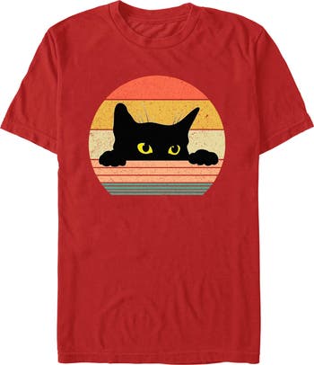 - Strut your stuff with this stylish new men's graphic t-shirt that is perfect for every occasion! Featuring curious cat with a retro sunset across the front.