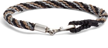 A sterling silver hook secures this macramé bracelet woven from tricolor thread and knotted by hand.