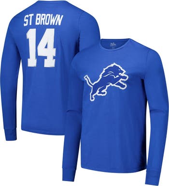 Cheer on the Detroit Lions with this stylish Amon-Ra St. Brown Name & Number Long Sleeve T-Shirt from Majestic Threads. This long sleeve tee is made from 100% cotton for a super-soft feel that's perfect for everyday wear. With a screen printed Detroit Lions logo on the front and Amon-Ra St. Brown's name and number displayed on the back, this shirt lets you rep the Detroit Lions in style.