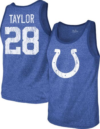 Though the NFL's most meaningful games are in the fall and winter, your passion for the Indianapolis Colts doesn't stop when the warm weather comes around. Enjoy those beautiful summer days while supporting your favorite team with this Jonathan Taylor Player Name and Number tri-blend tank top from Majestic Threads. Its distressed Indianapolis Colts graphics are a perfect vintage touch while you bask in the sun.