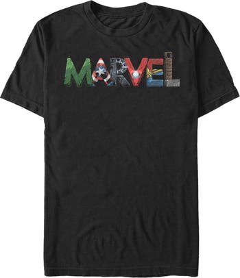 Lose yourself in the pages of a comic book or the movie adventure of a lifetime with your favorite Marvel superheroes! This graphic logo tee features the costumes of your favorite Avengers. Whether you want to strut through the city with Captain America, smash some walls with the Hulk, prowl the streets with Black Panther or sail through the air with Iron Man, Thor or Captain Marvel, you'll need to be wearing the best designs to do it! It's time to get marvel-ous with awesome graphic t-shirts!