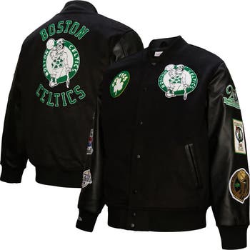 Channel the classic style of the Boston Celtics with this Mitchell & Ness Hardwood Classics Blackout Collection Full-Snap Varsity Jacket. This heavyweight jacket, crafted from a blend of wool and polyester, boasts faux leather sleeves and trim for a touch of classic varsity style. With chenille patches on the front and back, embroidered team patches on both sleeves and the team name proudly displayed along the right pocket, this jacket showcases your Boston Celtics pride in every detail.