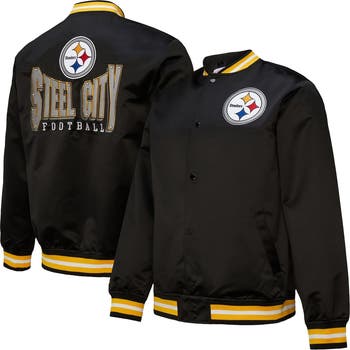 Add some classic Pittsburgh Steelers style to your wardrobe with this Double Down Satin Vintage Logo Varsity Full-Snap Jacket from Mitchell & Ness. This satin jacket features a vintage Pittsburgh Steelers logo and embroidered fabric appliques that add a touch of old-school cool to your game day look. With a classic rib-knit collar, cuffs and waistband, it provides a perfect fit while showcasing your team pride.