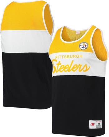 The Men's Mitchell & Ness Black Pittsburgh Steelers Team Tank Top is the perfect way to show your unwavering support for the Pittsburgh Steelers. With embroidered and screen-printed graphics, this tank top proudly displays your team pride. The front and back yoke with mesh fabric provides breathability, while the scoop neck and woven jock tag at the hem add a touch of style. Whether you're cheering on the Steelers at the stadium or just showing your support around town, this tank top is a must-have for any true fan.