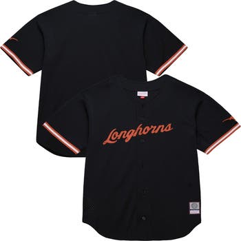 Help your gameday outfit score a style victory with this Texas Longhorns On The Clock fashion jersey from Mitchell & Ness. It's crafted with a full-body mesh fabric to provide a breathable and comfortable fit that's perfect for all-day wear around the ballpark. Plus, the full-button front and embroidered fabric appliques add a touch of classic baseball style to this must-have Texas Longhorns jersey.