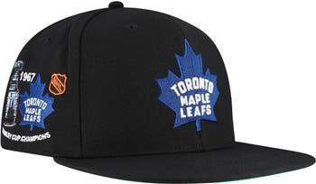 Complete your Toronto Maple Leafs look with this Core Top Spot Snapback Hat from Mitchell & Ness. The high crown and structured fit give this hat a modern look, while the flat bill and green undervisor add a touch of classic style. Featuring a commemorative patch embroidered on the right side, this hat is a must-have for any fan of the blue and white.
