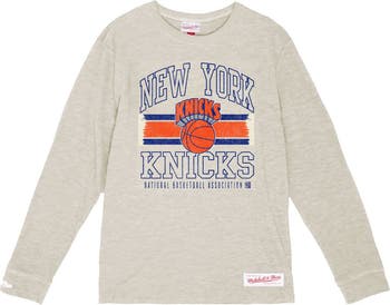 Rep your New York Knicks all season long with this Striped Logo Lockup Premium T-Shirt. From Mitchell & Ness, it features an eye-catching team graphic printed on the front for a bold look that's perfect for game days. This tee is finished with a classic crew neck cut and crafted from soft cotton fabric for premium comfort when cheering on the New York Knicks.