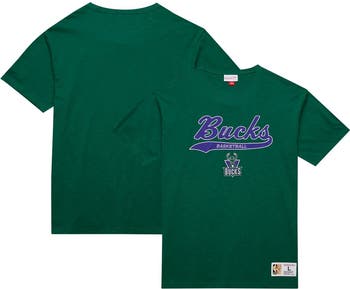 Channel the legacy of the Milwaukee Bucks with this Mitchell & Ness Hardwood Classics T-Shirt. The felt team name and logo appliqus are embroidered at the center chest for a striking, dimensional effect. Its soft, slub cotton construction and classic crew neck make this tee an easy choice for showing off your Milwaukee Bucks fandom.