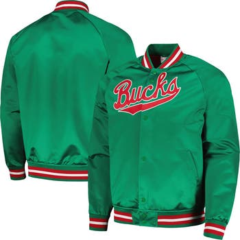 Throwback to the past with this comfortable Mitchell & Ness Wordmark full-snap jacket dedicated to the Milwaukee Bucks. Featuring raglan sleeves and instantly recognizable Milwaukee Bucks graphics and colors, this stunning piece of gear won't sit in your closet for long. As soon as cooler weather arrives, you'll be sporting this snazzy jacket.