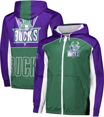 Men's Mitchell & Ness Green/Purple Milwaukee Bucks Hardwood Classics Big Shot Premium Full-Zip Windbreaker Jacket