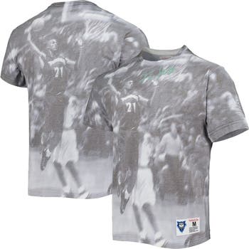 The Mitchell & Ness Kevin Garnett Above The Rim T-shirt is a must-have for true Minnesota Timberwolves fans. This heather gray tee features sublimated graphics and a woven jock tag at the hem, paying homage to the team's iconic style. Made from a comfortable cotton and polyester blend, this T-shirt is perfect for showing support for the Timberwolves, whether at the game or relaxing.