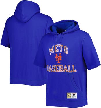 The Men's Mitchell & Ness Royal New York Mets Cooperstown Collection Washed Fleece Pullover Short Sleeve Hoodie is a must-have for any loyal New York Mets fan. This midweight hoodie is perfect for moderate temperatures, featuring a cozy fleece lining and a comfortable cotton-polyester blend. The embroidered New York Mets graphics and screen-printed wordmark proudly display your team spirit, while the raw-edge sleeve hem adds a touch of style. Whether you're cheering from the stands or simply showing your support, this hoodie is the perfect way to represent the New York Mets.
