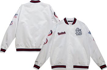 Make sure everyone knows how passionate you are about the St. Louis Cardinals by sporting this Mitchell & Ness City Collection jacket. It features a classic Varsity design with a satin finish and signature St. Louis Cardinals graphics down the sleeves. A full-snap front allows you to wear this jacket open or closed for a versatile display of team spirit.