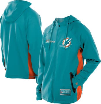 Stay warm while repping your favorite NFL franchise with this Miami Dolphins Combine Authentic Raglan Scuba Full-Zip Hoodie from New Era. With raglan sleeves and a drawstring hood design, this midweight jacket provides effortless mobility and a personalized fit that keeps you warm without getting in your way. The team logo and wordmark on the front proudly display your allegiance to the Miami Dolphins, making this a must-have for any dedicated fan.