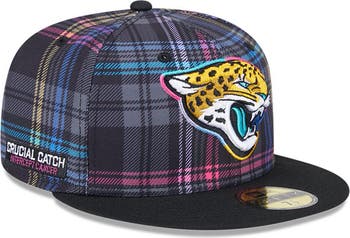 Help intercept cancer with the 2024 NFL Crucial Catch Collection. Adorned in the colors of various cancer ribbon colors, this New Era Plaid 59FIFTY Fitted Hat features your Jacksonville Jaguars logo, making it perfect for spreading awareness year-round. Join the Jacksonville Jaguars players as they wear this gear on the sideline during the month of October and beyond! The NFL does not profit from the sale of Crucial Catch products. Charitable contributions are awarded by the NFL Foundation to the American Cancer Society. For more information, please visithttp://www.NFL.com/CrucialCatch