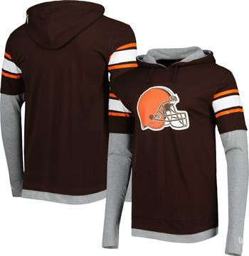 The Men's New Era Brown Cleveland Browns Long Sleeve Hoodie T-Shirt is the perfect way to show unwavering support for the Cleveland Browns. Made from soft cotton, this hoodie features a front pouch pocket for convenience and a drawstring hood for added warmth. Screen-printed graphics proudly display the Cleveland Browns logo, making team allegiance clear. Whether cheering from the stands or relaxing, this hoodie ensures comfort and style.