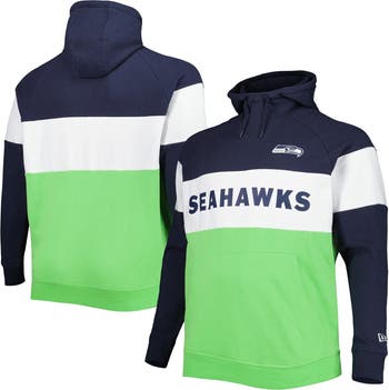The Men's New Era College Navy/Neon Green Seattle Seahawks Big & Tall Current Team Colorblock Fleece Raglan Pullover Hoodie is the ultimate way to show unwavering support for the Seattle Seahawks. This midweight hoodie features a cozy fleece lining, perfect for chilly game days. The colorblock design and screen-printed graphics proudly display Seahawks pride, while the scuba hood with drawstring provides added warmth and comfort. Whether cheering from the stands or showing support, this hoodie is the perfect way to represent the Seattle Seahawks in style.