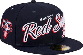 Complete your Boston Red Sox game day look with this New Era Script Sided Fitted Hat. This 59FIFTY cap boasts a classic high crown and structured fit, making it a timeless addition to any fan's collection. With its embroidered script wordmark and fabric applique, this hat effortlessly blends classic style with intricate details.