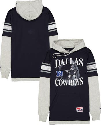 Show off your die-hard team pride with this unique Dallas Cowboys Twofer Layered Long Sleeve Hoodie T-Shirt from New Era. The team graphic printed at the center chest features distressed details, adding a vintage touch to your look. Whether you're at the stadium or relaxing at home, this hoodie tee is a must-have for any Dallas Cowboys fan.