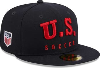 Make a statement while supporting the USMNT in this 59FIFTY Text fitted hat from New Era. An embroidered graphic of "U.S. Soccer" stands out in raised detail on the front, while the team's crest and "USA" are featured on the right panel and back. A high-crown, structured build gives this hat a precise fit, making it a comfortable option to show your USMNT pride any day of the week.
