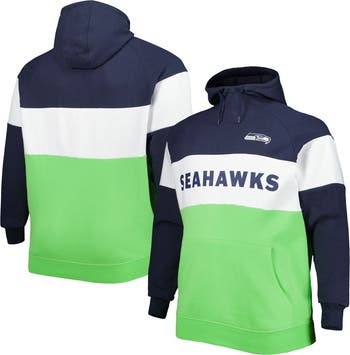 The Men's New Era Neon Green/College Navy Seattle Seahawks Big & Tall Current Colorblock Raglan Fleece Pullover Hoodie is the ultimate way to show your unwavering support for the Seattle Seahawks. This midweight hoodie features a vibrant colorblock design and a cozy fleece lining, making it perfect for moderate temperatures. The raglan sleeves and scuba hood with drawstring provide a comfortable and stylish fit, while the screen print graphics proudly display your Seahawks pride. Whether you're cheering from the stands or simply showing your support, this hoodie is the perfect way to represent the Seattle Seahawks in style.