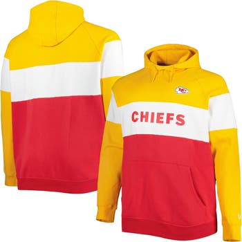 The Men's New Era Red/Gold Kansas City Chiefs Big & Tall Current Colorblock Raglan Fleece Pullover Hoodie is the perfect way to show your support for the Kansas City Chiefs. Made from a soft cotton and polyester blend, this midweight hoodie features a fleece lining for added warmth during chilly game days. The colorblock design and screen print graphics proudly display your Kansas City Chiefs pride, while the raglan sleeves and scuba hood with drawstring provide a comfortable and stylish fit. Whether you're cheering from the stands or simply showing your support, this hoodie is the perfect way to represent the Kansas City Chiefs in style.