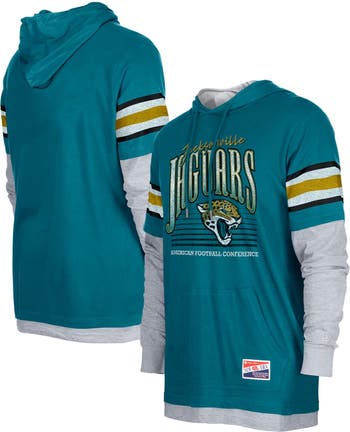 Gear up for game day with this Jacksonville Jaguars Twofer Long Sleeve Hooded T-Shirt from New Era. The heather gray sleeves and hood interior add a stylish contrast to the team color body, while distressed detailing on the chest graphic and faux sleeves enhances the vintage aesthetic. Plus, the soft fabric ensures lasting comfort whether you're cheering from the stands or showcasing your Jacksonville Jaguars spirit around town.