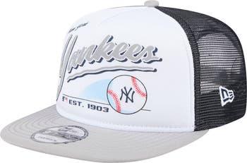 Express your love for the New York Yankees in vintage style with this Retro Script Trucker 9FIFTY Snapback Hat from New Era. This stylish snapback features a classic high crown and flat bill, two-toned colors and solid front panels showcasing a stylized New York Yankees graphic and wordmark for throwback flair. The mesh mid and rear panels provide breathability, making it perfect for all-day wear.