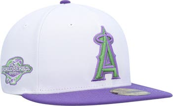 Add a snazzy hat to your lineup of Los Angeles Angels gear by grabbing this 2002 World Series Side Patch 59FIFTY fitted hat from New Era. The purple and green embroidery pops off the solid white panels for a bold addition to any game day look. The fitted construction provides a consistent wear each time you reach for this cap.