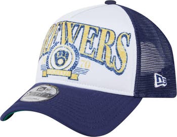 Add some vintage style to your Milwaukee Brewers game-day look with this New Era Distressed 9FORTY A-Frame Adjustable Trucker Hat. This hat features distressed Milwaukee Brewers graphics on the front, giving it a lived-in look that's perfect for any fan. With its solid front panel and breathable mesh mid and rear panels, this hat will keep you cool and comfortable all game long.