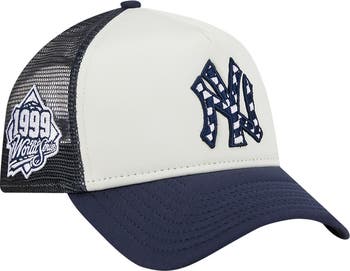 Rock this New York Yankees Checkered Flag A-Frame Trucker 9FORTY Adjustable Hat from New Era for a fresh take on classic team style. This New York Yankees hat boasts a structured fit and features a curved bill for a classic look. Its unique design includes raised checkered embroidery on the solid front panels and four mesh mid and rear panels for added breathability. Topped off with a commemorative 1999 MLB World Series Championship applique on the right-side crown, this hat is a must-have for any Yankees fan.
