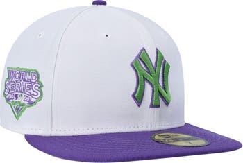 Add a snazzy hat to your lineup of New York Yankees gear by grabbing this Side Patch 59FIFTY fitted hat from New Era. The purple and green embroidery pops off the solid white panels for a bold addition to any game day look. The fitted construction provides a consistent wear each time you reach for this cap.