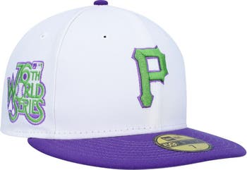 Add a snazzy hat to your lineup of Pittsburgh Pirates gear by grabbing this 1979 World Series Side Patch 59FIFTY fitted hat from New Era. The purple and green embroidery pops off the solid white panels for a bold addition to any game day look. The fitted construction provides a consistent wear each time you reach for this cap.