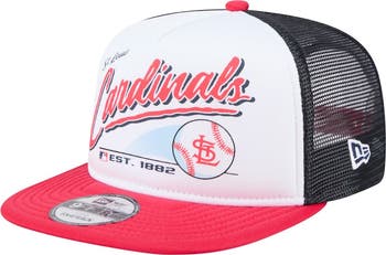 Express your love for the St. Louis Cardinals in vintage style with this Retro Script Trucker 9FIFTY Snapback Hat from New Era. This stylish snapback features a classic high crown and flat bill, two-toned colors and solid front panels showcasing a stylized St. Louis Cardinals graphic and wordmark for throwback flair. The mesh mid and rear panels provide breathability, making it perfect for all-day wear.
